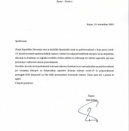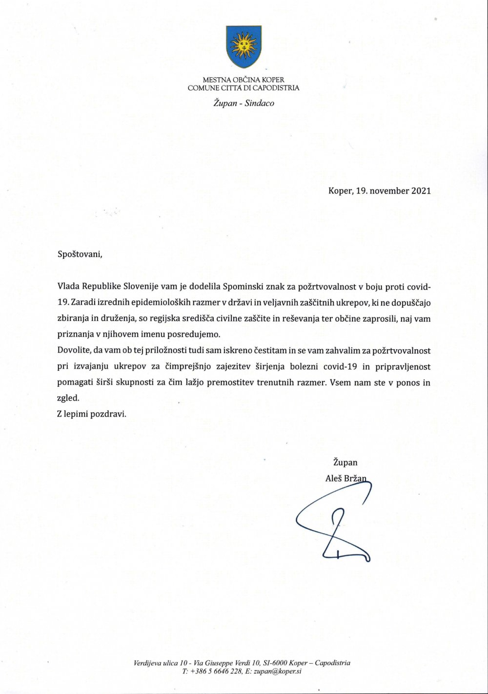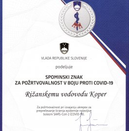 Vlada republike Slovenije je Rižanskemu vodovodu Koper podelila spominski znak za požrtvovalnost v boju proti covid-19