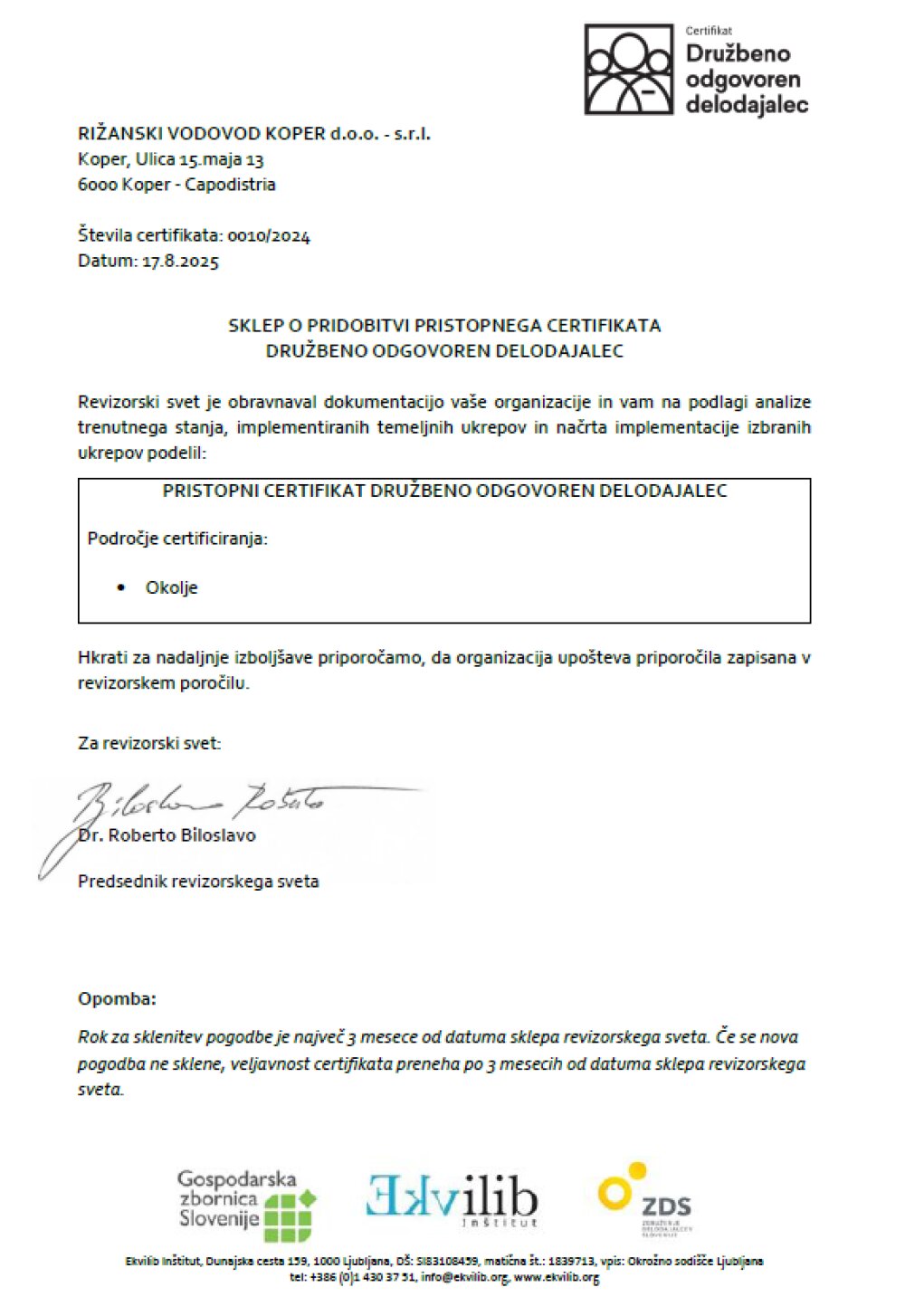 Z veseljem sporočamo, da smo poleg Naprednega certifikata na področju ZDRAVJE IN VARNOST PRI DELU, letos prejeli še pristopni certifikat za dodatno področje OKOLJE.